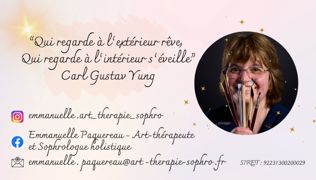 Mon parcours personnel et professionnel m’ont permis d’acquérir des connaissances et compétences comme la connaissance de soi et des émotions, le développement personnel, transmises lors de mes formations certifiant es d’Art-thérapie et de Sophrologie Holistique, de lecture de livres et particulièrement la connaissance du public des enfants au sujet des émotions et des troubles des apprentissages.J’ai envie à présent d’accompagner les enfants d’une autre manière ainsi que les adultes pour qu’ils retrouvent leur âme d’enfant.